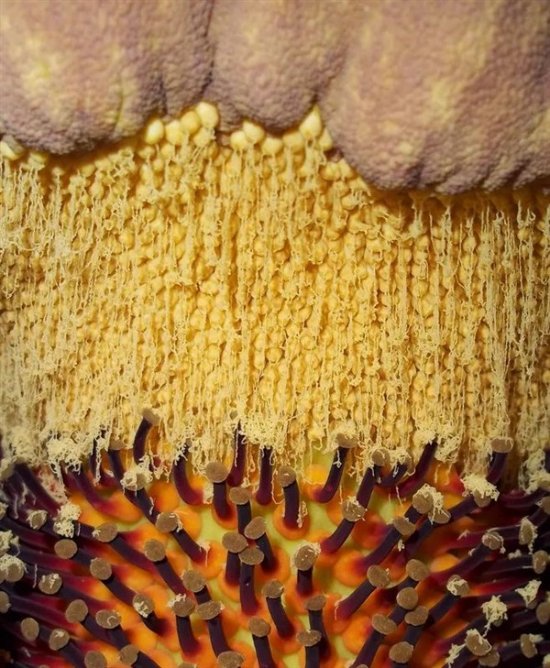 与此同时,随着佛焰苞逐渐打开,花朵中间的那根“棍子”会将温度升到40C,高温有助于将它的腐臭味传播至更远的地方。据研究表明,这样的生物机制足以吸引一公里外的苍蝇和甲虫。