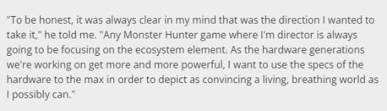 德田裕也表示:“老实说,我心里一直很清楚我们的目标是什么。任何由我担任总监的《怪物猎人》游戏都会把重点放在生态系统元素上。随着我们正在开发的硬件越来越强大,我希望最大限度地利用硬件规格,尽可能逼真地描绘出一个活生生的世界。”