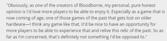 “显然,作为《血源》的创作者之一,我个人最真诚的想法是希望更多玩家能够享受它。特别是作为一款已经非常成熟且‘迷失’在旧硬件上的游戏来说,如果能有机会让更多玩家体验并重温这一款老游戏,那将是一件非常好的事情。因此,就我而言,这绝对不是我会反对的事情。”