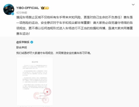 新浪体育报道,6月13日,王一博及乐华娱乐方面发布声明,称有人闯入包场且非公开的赛车练习禁区,造成极大的安全隐患。