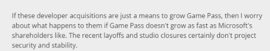 因为如果收购这些开发商只是发展XGP的一种手段,一旦这项订阅服务的增长速度不如微软股东所希望的那样快,他们会怎么样。最近的裁员和工作室关闭或再次上演。