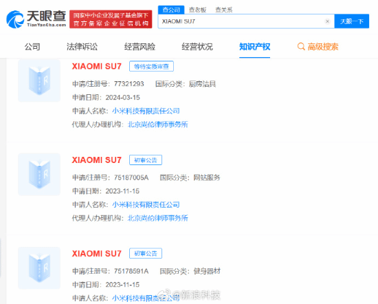 自去年11月起,该公司已申请多枚“小米SU7”“XIAOMI SU7”商标,其中多枚“XIAOMI SU7”商标也已进入“初审公告”状态,即将注册成功。
