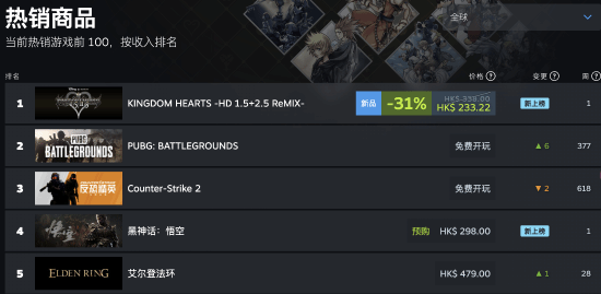 Steam全球热销榜显示,《王国之心 HD 1.5&2.5 ReMIX版》首日就登上了Steam全球热销榜第一名。