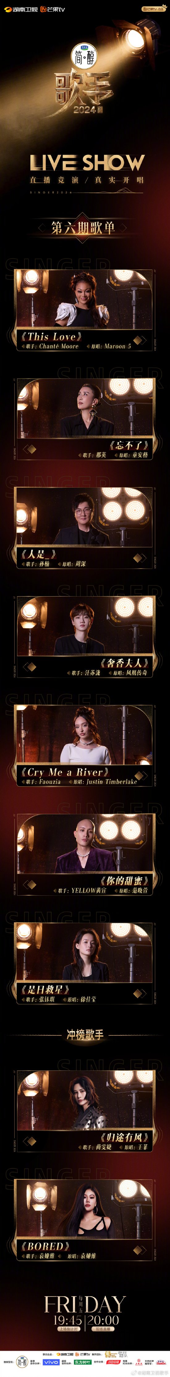 《歌手2024》第六期歌单现已出炉:《This Love》—香缇莫、《忘不了》—那英、《人是_》—孙楠、《奢香夫人》—汪苏泷、《Cry Me a River》凡希亚、《你的甜蜜》—黄宣、《是日救星》—张钰琪、《归途有风》—尚雯婕、《BORED》—袁娅维,今晚8点开播。
