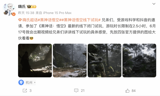游戏主播嗨氏也发微博表示,自己也参加了《黑神话:悟空》最新的线下闭门试玩,游玩时长限制在2.5小时,17日会出视频讲讲具体感受。