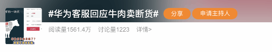 今日,微博话题“华为客服回应牛肉卖断货”冲上热搜榜。