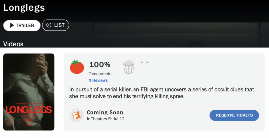 尼古拉斯·凯奇恐怖新片《长腿怪》在烂番茄的评分已解禁,目前100%新鲜度。电影将于7月12日北美上映,已在内部抢先试映中获得不错的口碑。