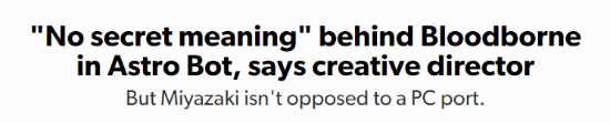 在此前的《宇宙机器人》预告中,有玩家发现《血源》的机器人形象出现在了游戏当中,引发猜测。有人开始觉得这是索尼再次重视该IP的象征。