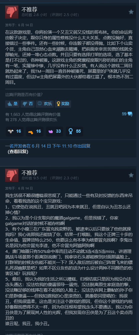 玩家们普遍反映《活侠传》的游戏机制存在严重问题,特别是骰子决定命运的设计让许多玩家感到挫败。有玩家评论道:“在这款游戏里,你将扮演一个又丑又弱又没钱的哥布林。你的命运将由骰子决定,跟你自身的属性修炼没什么太大关系,点数没抛好,直接错过一些事件。”