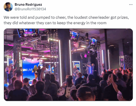 随后,一位现场观众在推特上解释了原因:他们被告知要大声欢呼以营造现场气氛,而且欢呼声最大的人会获得奖品。这些奖品包括游戏耳机、5小时免费能量饮料等等。