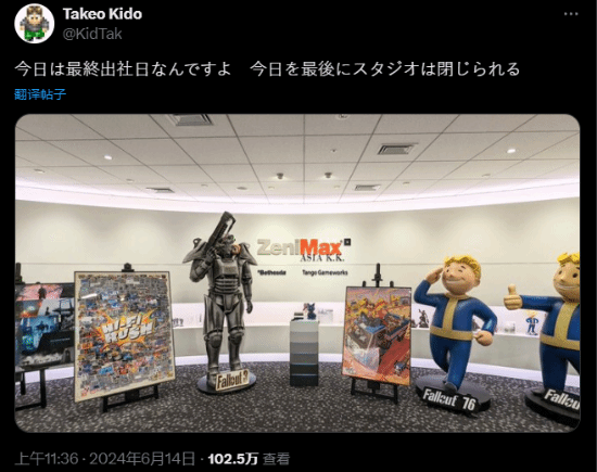 6月14日是Tango Gameworks工作室正式关闭前的最后一天,开发者Takeo Kido通过社媒分享了工作室的接待大厅、《HIFI RUSH》《辐射》游戏周边、打包工作用品和聚餐的图片。