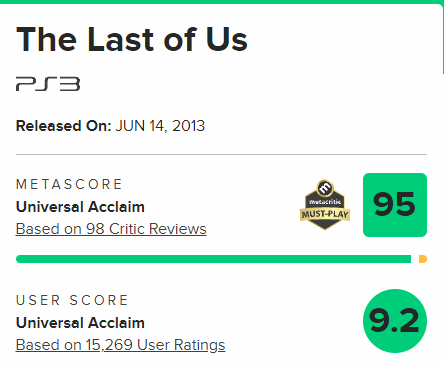 《最后生还者》2013年发售后获得了普遍好评,游戏的剧情、游戏性、视觉效果、声音设计、人物塑造和描述都得到了赞誉,还被誉为有史以来最伟大的电子游戏之一。至今在M站评分高达95。