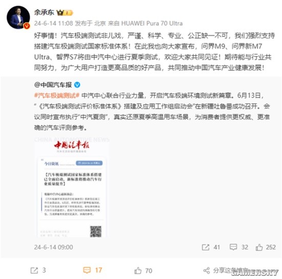 余承东在转发时明确表示:好事情!汽车极端测试非儿戏,严谨、科学、专业、公正缺一不可,我们强烈支持搭建汽车极端测试国家标准体系!