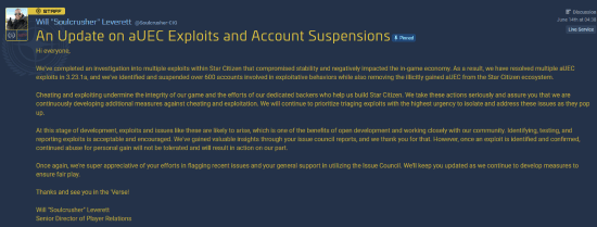 据外媒gamerant报道,大型太空模拟游戏《星际公民》近日封禁了超600个游戏账户,理由是有玩家利用漏洞非法获得游戏货币aUEC(Alpha United Earth Credits),从而导致游戏内的经济系统不平衡,我们一起来看一下。