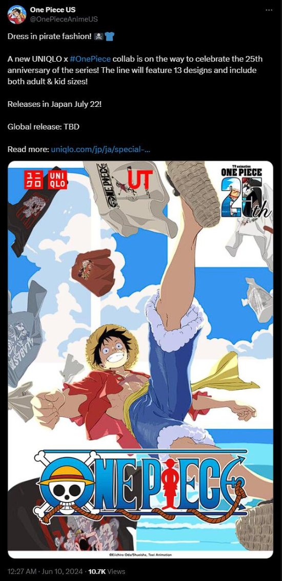 《海贼王》官方宣布,为庆祝系列25周年的到来,即将推出同优衣库进行联动设计的新品。新品将包含13种款式,涵盖成人尺寸和儿童尺寸。