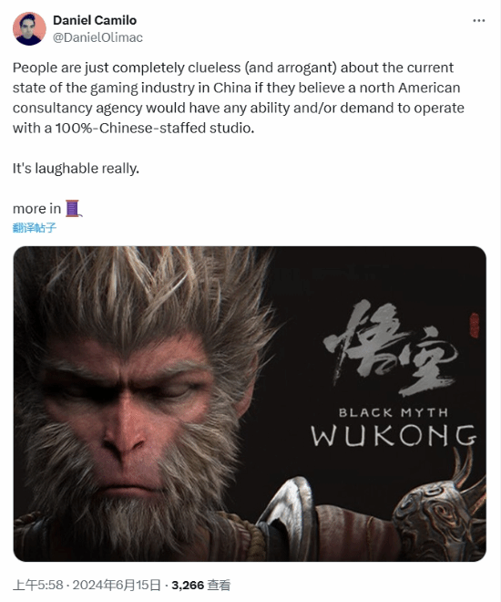 他在推文中批评了一些关于中国游戏产业现状的误解,强调游戏科学是一家完全中国本土化的工作室。