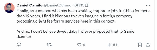 另外,他认为,一个西方公关公司在中国的语境中提出700万美元的服务费用简直是难以想象的,并表示不相信Sweet Baby Inc曾向游戏科学提出这样的报价。