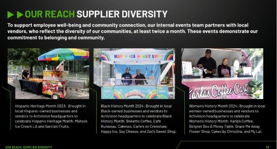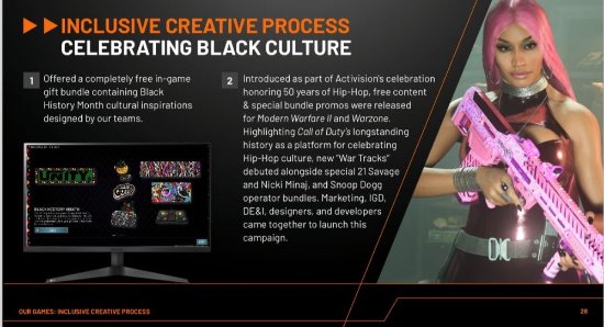 Kern列举了多个例子来说明他的观点:包括在描绘弥助时会响起说唱音乐;《使命召唤》通过推出嘻哈音乐合集和Snoop Dogg、Nicki Minaj的角色包来“庆祝黑人文化”;动视暴雪声称其供应链多样化,但展示的却是墨西哥卷饼车。