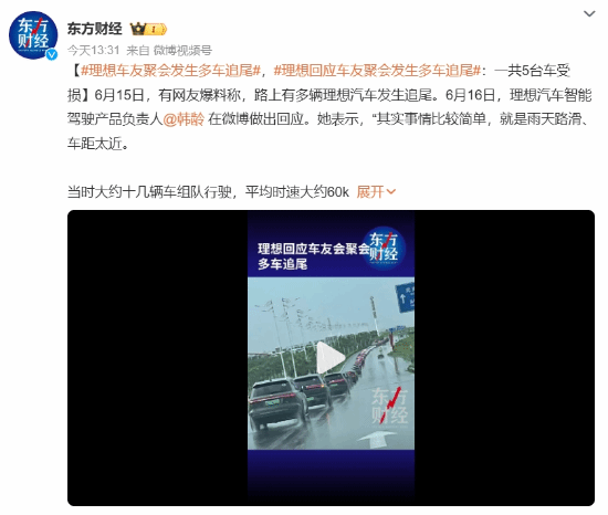 理想车友聚会发生多车追尾 理想回应:雨天路滑