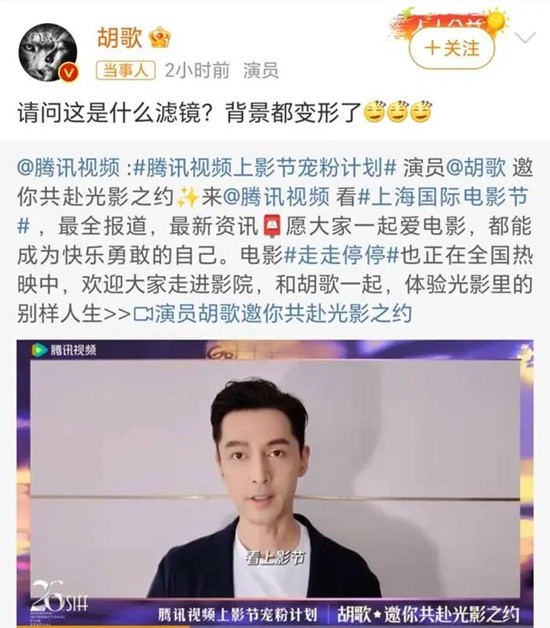 近日,第二十六届上海国际电影节盛大举行,腾讯视频发胡歌宣传上影节以及自己新电影《走走停停》,可是视频滤镜效果引起胡歌本人质疑。该话题也登上热搜,引起网友热议。