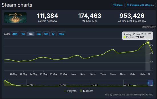 从数据统计网站SteamDB可以看到,《艾尔登法环》的同时在线玩家在昨日(6月16日)达到了顶峰,为174463名。gamerant表示,《艾尔登法环》的玩家数量在今年3月就增加了一倍多,从那时起,《艾尔登法环》的玩家峰值一直保持在50000名以上,截止6月7日就已破了十万名的大关。