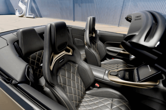 该车座舱采用黑色定制座椅,并配有复杂的菱形缝线,扶手、中控台和许多其他细节都是根据金色规格定制,镀铬饰面的 MANUFAKTUR 字样等标志性元素凸显了汽车的非凡个性。新车配备有 12.3 英寸液晶仪表和 11.9 英寸中控大屏,标配第二代 MBUX 人机交互系统。同时还提供 AMG TRACK PACE 虚拟竞赛工程师车载应用。
