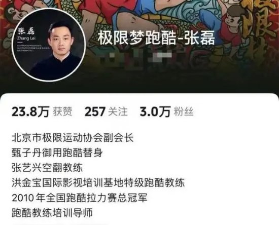 公开资料显示,张磊2006年练习跑酷,获得2010年“蓝色风尚杯”全国跑酷大赛总冠军;2010年担任洪金宝国际影视培训基地特级跑酷教练;2012年创办北京极限梦跑酷俱乐部,研发跑酷健身、儿童体能跑酷、跑酷空翻、跑酷特技等特色跑酷课程,开始面向大众授课;2016年根据事故灾难、公共卫生事件、社会安全、自然灾害四个维度发起了以跑酷运动为核心的《儿童安防自救》公益活动,推向社会团体单位。