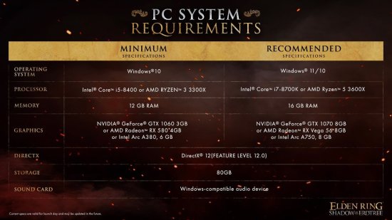 而在此前,《黄金树幽影》也正式公布了PC版的配置需求,显卡最低为英伟达GTX 1060 3GB,推荐GTX 1070 8GB显卡,内存最低要求12GB,推荐16GB,系统兼容Win10与Win11。