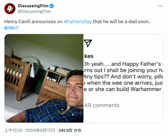 近日,“大超”亨利·卡维尔在社交媒体晒了一张婴儿床的照片,并发文表示自己即将要加入爸爸们的行列,我们一起来看一下。