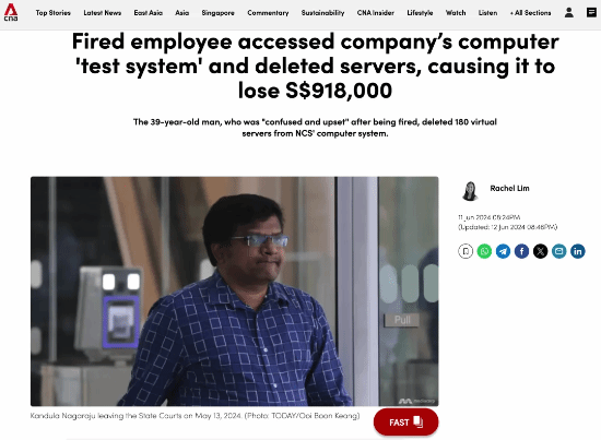 据外媒 CNA 报道,一名任职于新加坡 NCS 集团的印度工程师 Kandula Nagaraju,因被解雇后心生不满而采取了“删库”的报复行动,造成 91.8 万新加坡币(约 493.3 万元人民币)的损失,被判两年零八个月监禁。