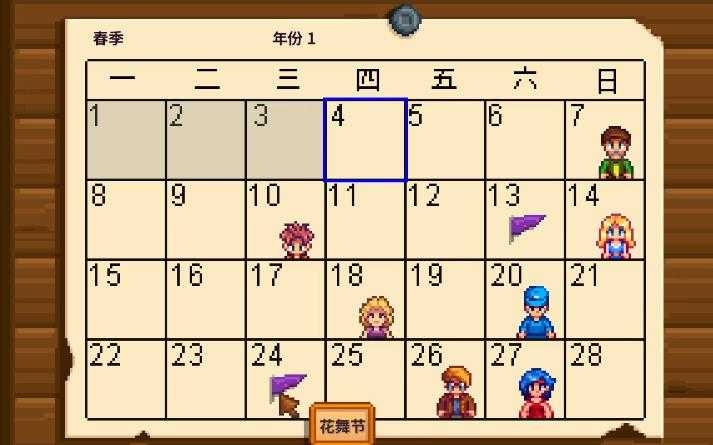 在星露谷物语当中,玩家可以参加各种节日,其中非常有意思的就是花舞节了,花舞节是在春季的24日举办,你需要在早上的9点到下午的2点之间进入森林参加节日,不然就会错过。你可以邀请一位和你好感度在4心以上的单身NPC一起跳舞。并且你可以在花舞节的商店当中,购买花舞节独有的稻草人和其他花束制作图纸,特别是稻草人一定要买的,因为我们会有一个所有稻草人收集的成就,对于成就党来说绝对不容错过。