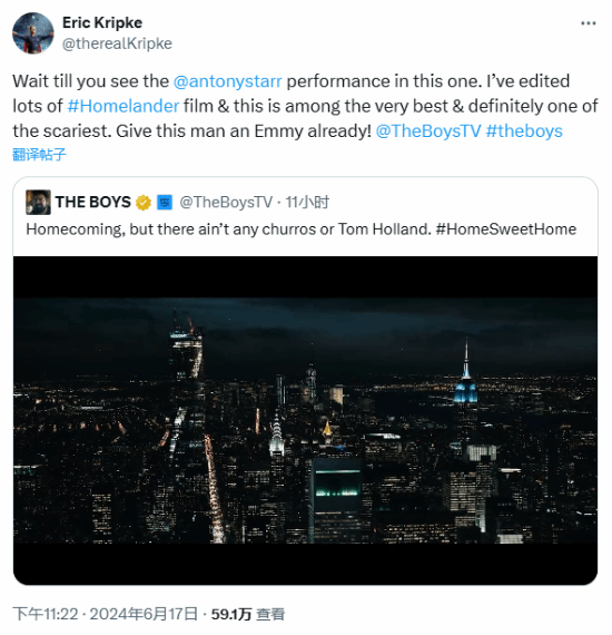 《黑袍纠察队》第四季的第四集官方预告片现已放出,主创Eric Kripke也转发了这一消息,并表示:“等着在这集看安东尼·斯塔尔的表演吧,我剪辑过很多关于祖国人的片段,这集是最好的片段之一,同时也是最可怕的片段之一,快给这个人一个艾美奖吧!”