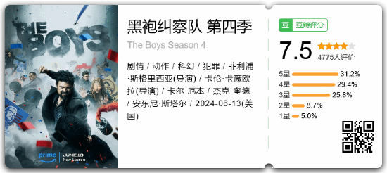 截至发稿前,《黑袍纠察队》第四季的烂番茄新鲜度为95%,豆瓣评分为7.5分。