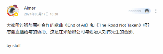 日前,日本女歌手Aimer发布了一张在米哈游公司与创始人刘伟先生的合影,她曾与《原神》合作,演唱了《End of All》和《The Road Not Taken》。