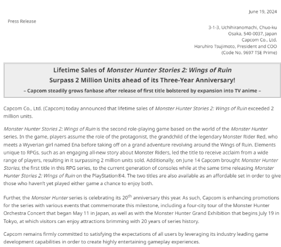 今日(6月19日),卡普空官方宣布《怪物猎人物语2:破灭之翼》累计销量突破200万份。