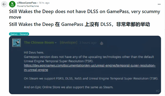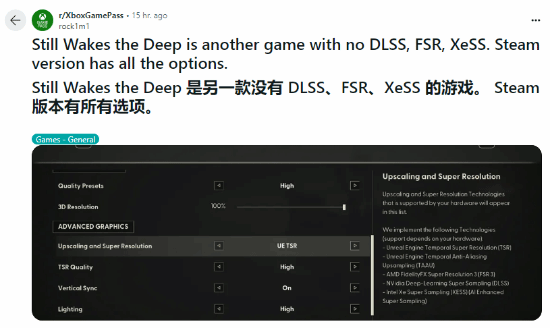 但PC玩家在游玩该作之后发现,PGP版本相比Epic和Steam版本缺少了一些高级图形选项,包括DLSS、FSR、XeSS等,这引发了不少网友吐槽。