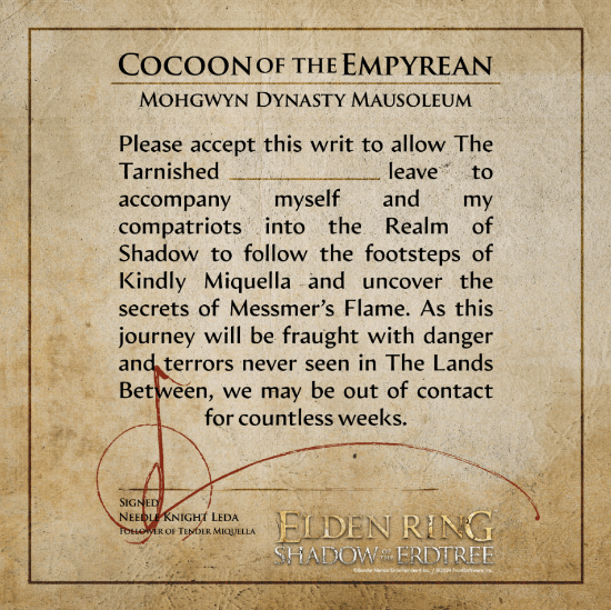 《艾尔登法环》DLC《黄金树幽影》即将上线,无数玩家正在热切期盼着它的到来。今日,万代南梦宫再次为DLC预热,发布了“金针骑士”蕾妲为褪色者准备的请假条模板。