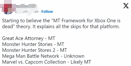 有玩家猜测,这是因为卡普空的MT Framework引擎在Xbox One上被淘汰了,这可以解释为什么卡普空的其他合集也没有在Xbox One上发布。此外,也有人推测是卡普空认为不值得花费时间、精力和资源将其MT Framework合集移植到Xbox One上,但同样,由于没有官方消息,这些目前都只是猜测。