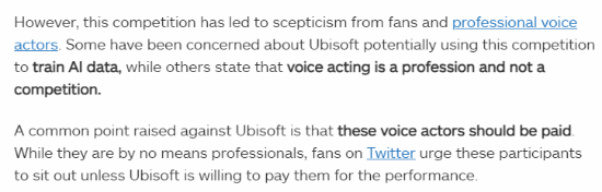 然而,该活动并没有像工作室预期的那样顺利发展。这场比赛引发了一些粉丝和专业配音演员的质疑,部分人担心育碧可能会利用这次比赛来训练人工智能数据;而另一些人则表示配音是非常职业的事情,而不是粉丝比赛。还有人敦促这些参与者退出,除非育碧愿意为他们的表演付费。