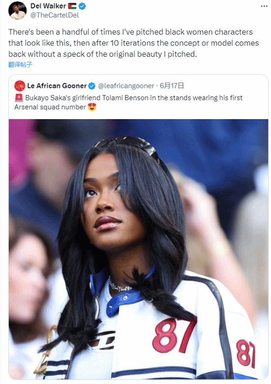 Del walker转发了一张英格兰/阿森纳球星布卡约·萨卡女友照片,并表示:“我曾多次向客户推荐设计这样的黑人女性角色,但经过10次反复修改后,角色的概念或模型已经被改动的完全没有我最初推荐的那种美感。”