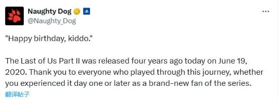 当地时间2024年6月19日,顽皮狗官方推特发布了推文:"Happy birthday, kiddo."