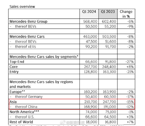 如果说梅赛德斯-奔驰2023年的日子还不算太难过,今年一季度,则迎来了苦日子。财报显示,2024年第一季度,梅赛德斯-奔驰实现营收358.73亿欧元,同比下滑4.4%;息税前利润38.63亿欧元,同比下滑30%;净利润30.25亿欧元,同比下滑25%。不仅是营收净利双双下滑,销量方面也可谓惨淡。2024年第一季度,梅赛德斯-奔驰乘用车和轻型商务车累计销量为56.84万辆,其中乘用车销量为46.3万辆,同比下降8%。在亚洲地区销量为21.07万辆,同比下降15%。其中,中国市场销量为16.81万辆,同比下滑12%。
