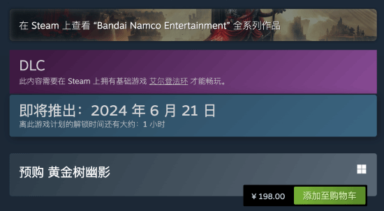根据之前官方公布的解锁时间,《艾尔登法环》DLC《黄金树幽影》的PC版本将于6月21日早6点解锁,但Steam页面显示,距离计划解锁时间仅剩一小时。