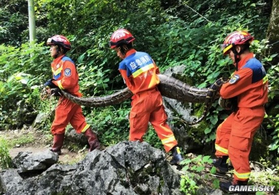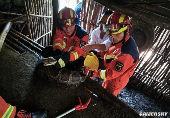 消防人员到达现场后,发现这条巨蟒不仅体型庞大,且因吞食猎物后行动迟缓。为了保证人畜安全,四名全副武装的消防员使用绳索固定住蛇头,避免其在捕捉过程中对人造成伤害。随后,他们小心翼翼地将巨蟒从羊圈中转移出来,并将其装入一个坚固的编织袋中。经过确认,这条蟒蛇为网纹蟒,其体型庞大,身长超过3米,重量约80斤,实属罕见。