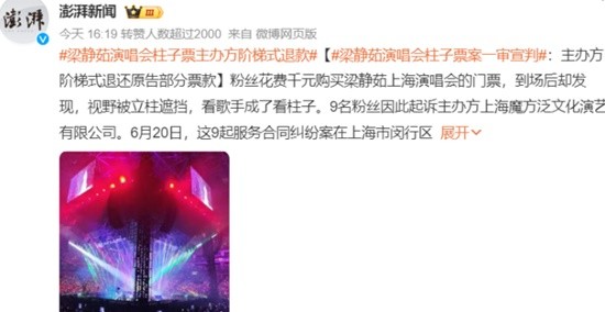 据澎湃新闻报道,粉丝花费千元购买梁静茹上海演唱会的门票,到场后却发现,视野被立柱遮挡,看歌手成了看柱子。9名粉丝因此起诉主办方上海魔方泛文化演艺有限公司。