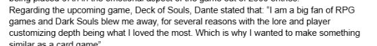 “我是 RPG 游戏的忠实粉丝,《黑暗之魂》对我的影响非常深刻。我喜欢它的原因有很多,其中我感兴趣的是游戏本身的各种故事和传说,以及玩家的高自由度。这也是为什么我想制作类似的卡牌游戏的理由。”