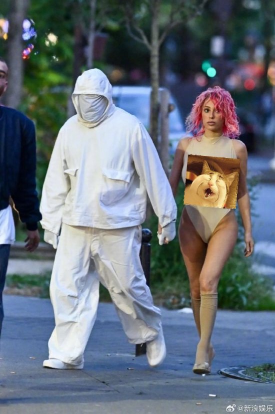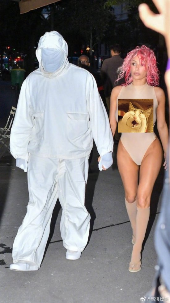侃爷从头到脚都裹上白色布料,连手指尖也不放过,比安卡一头粉色卷发十分吸睛。一个看起来挺冷的,一个看起来挺热的。