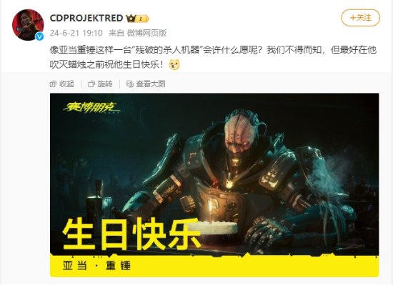 在无人关心的角落里,《赛博朋克2077》的大恶人亚当重锤迎来了自己的生日,官微发文为这台杀人机器送上祝福。