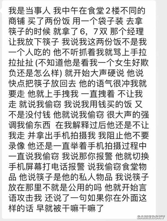 当事女生称:“在食堂商铺买2份饭拿了六七双筷子,食堂工作人员说我偷窃食堂物品,她向对方解释称,这两份饭并不是她一个人吃。