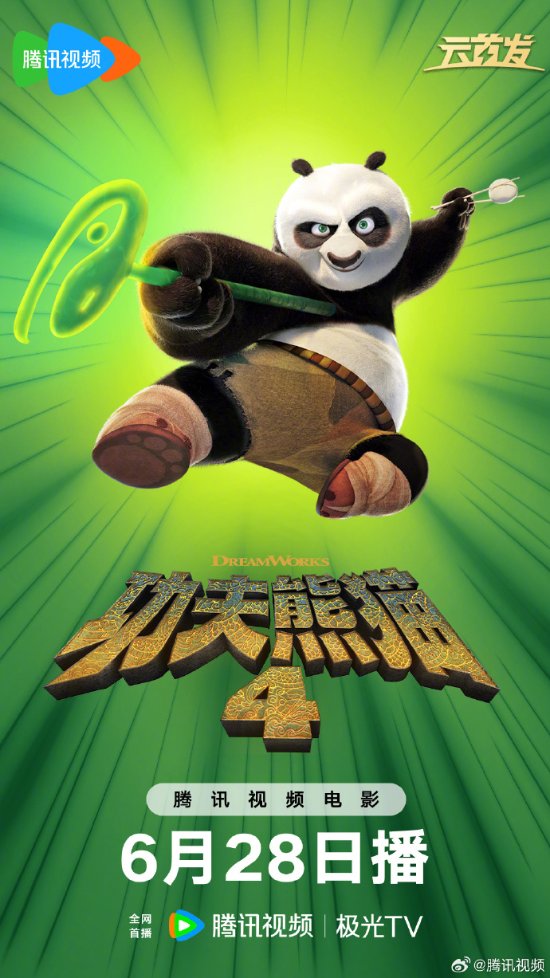 《功夫熊猫4》官宣网播定档6月28日,爱奇艺、优酷、腾讯视频均可以观看。